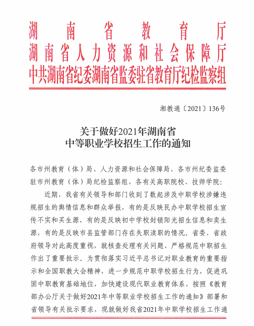 近日,为贯彻落实国家和我省职业教育改革实施方案,规范中职学校招生办学行为,实现阳光招生,湖南省教育厅、湖南省人力资源和社会保障厅、中共湖南省纪委湖南省监委驻省教育厅纪检监察组联合发布《致全省应届初三学生及家长的一封公开信》,郑重提醒中考学子明明白白选学校,轻轻松松奔前程。