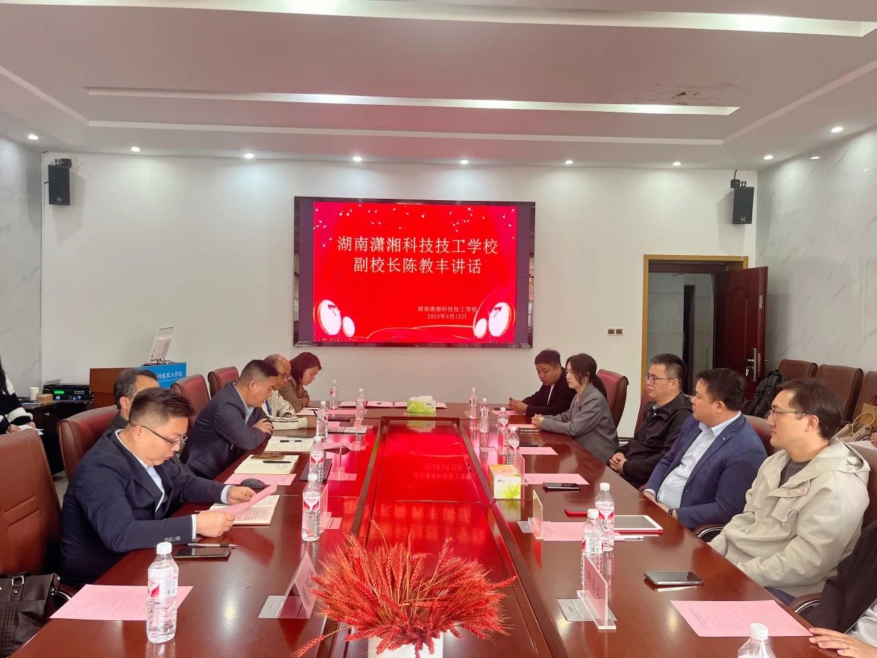 4月12日上午,我校举行“新东方高考研究院湖南课程合作中心”战略合作协议签约暨揭牌仪式。新东方高考研究院职教负责人麻东野、顾问鲍昕、广东合作伙伴邱昌文,湖南职校网总经理申立林一行受邀莅临我校,前来沟通新东方高考研究院“湖南课程合作中心”事宜,我校校长谢飞、党支部书记戴华、副校长陈教丰,教务科主任黄瑛、财务科主任唐艳丽等领导列席,本次签约仪式由湖南潇湘科技技工学校党支部书记戴华担任主持。