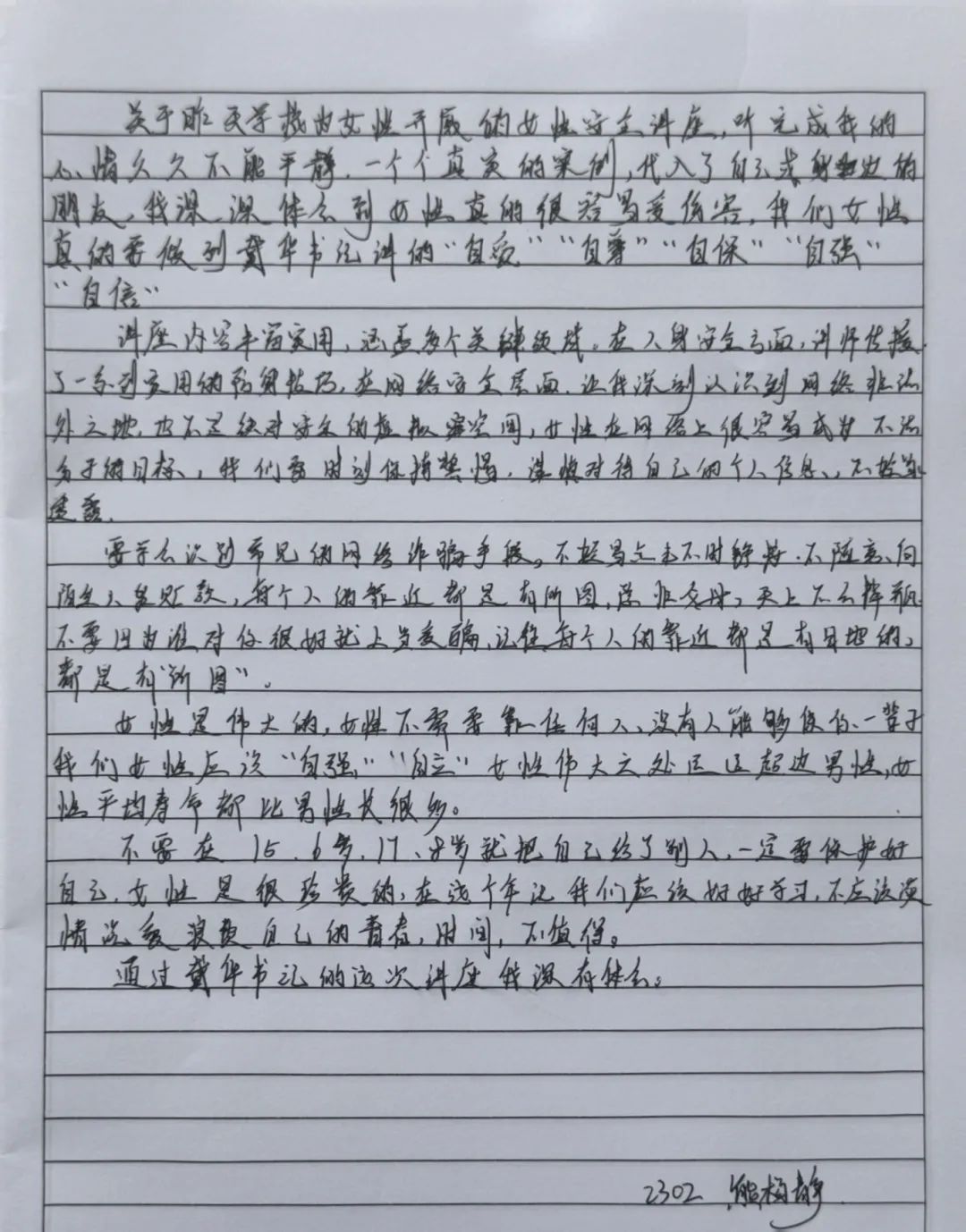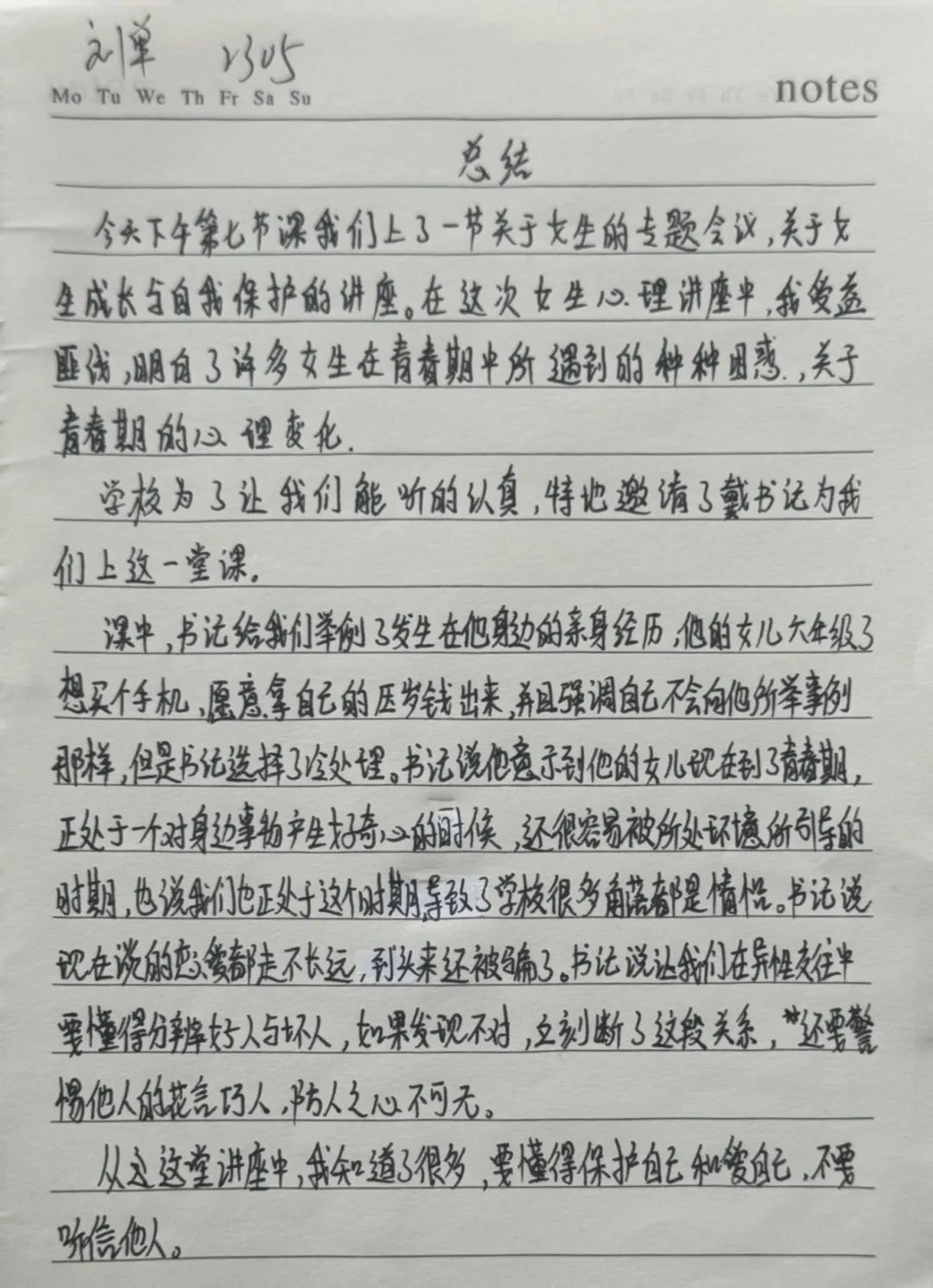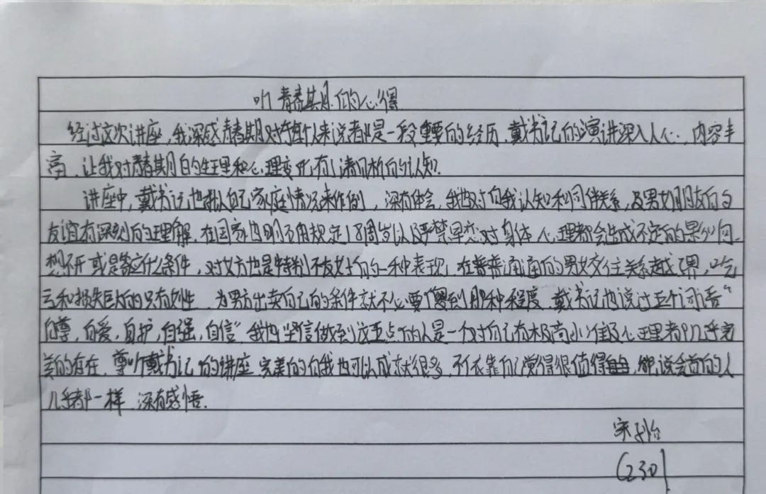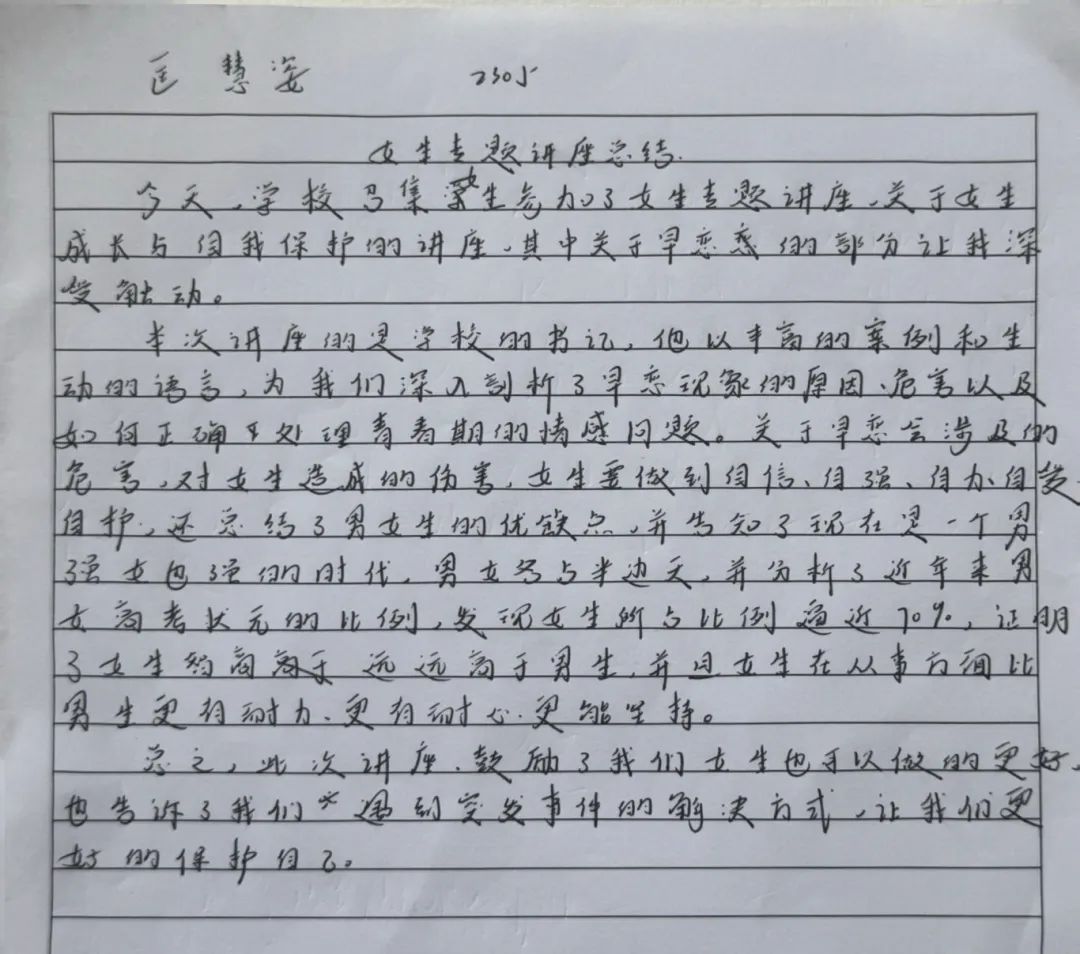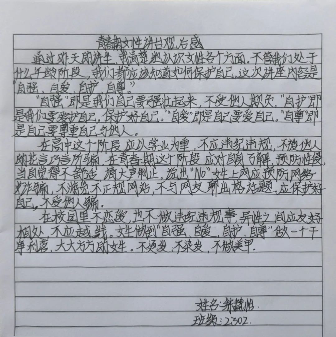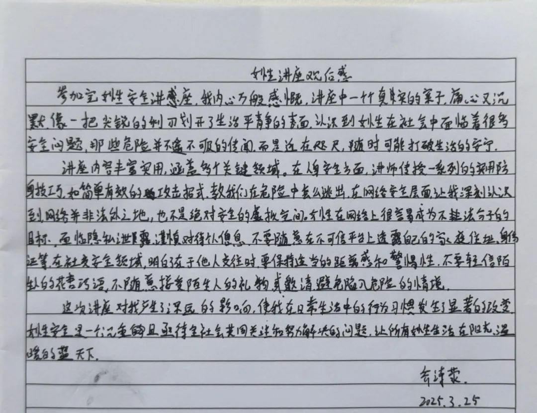 戴书记的讲座,从青春期心理到社会生存法则,从外在形象管理到内在人格塑造,为女生们构建了一道立体化的“成长防护网”。美可以张扬,但需扎根于修养的土壤;个性可以绽放,但应生长在规则的阳光下。这场讲座没有空洞的说教,而是用真实案例与温情对话,为女生们勾勒出成长的坐标系。正如戴书记所言:“最好的保护,是教会你们成为自己的太阳。”愿每位女生都能以智慧为帆、以自尊为锚,在青春的海洋中破浪前行!