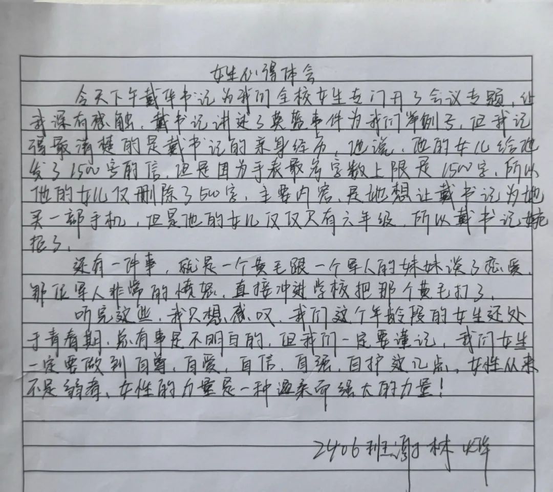 随后,学工处贺主任从校园管理角度补充强调:学校将建立“心理辅导+安全巡查”双机制,严打欺凌行为,为女生成长保驾护航。“你们的每一声求助,都会得到学校的郑重回应。”